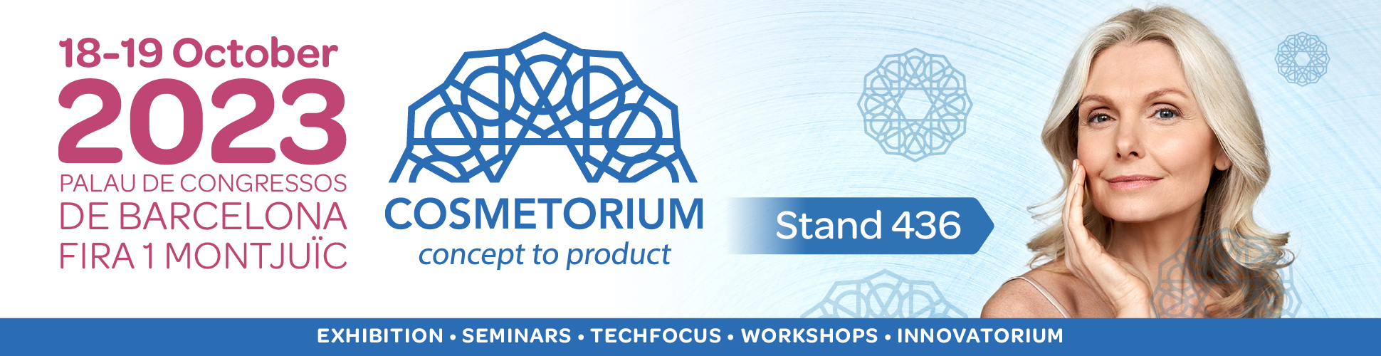 – COSMETORIUM: The COSMETORIUM exhibition will be held during the 18th and 19th October. This event will take place at Palau de Congressos de Barcelona. Where you can find many indispensable tools for the creation and manufacture of innovative cosmetic products. You will find us at Stand 436.